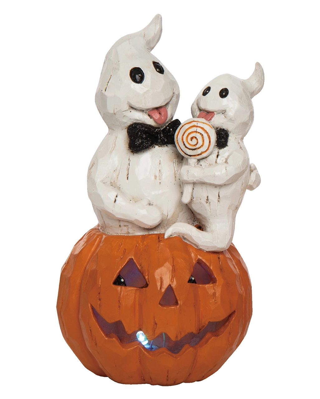 Lasst euch verzaubern von den beiden niedlichen Gespenstern, die es sich auf einem Halloween Kürbis gemütlich machen. Der Geister Papa und sein Kind lassen sich einen Lutscher schmecken, denn sie beim Trick or Treat bekommen haben. Diese Geister mit Lutscher auf Leuchtkürbis Szene sorgt als stimmungsvolle Halloween Deko Figur für echtes Gruselnacht Flair. Vor allem für Familien mit Kindern ist diese süße Jack O’Lantern Deko perfekt.